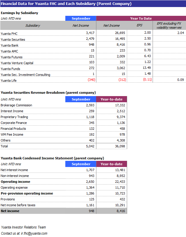 Announcement of Yuanta Financial Holding Company’s un-audited net income for September, 2025