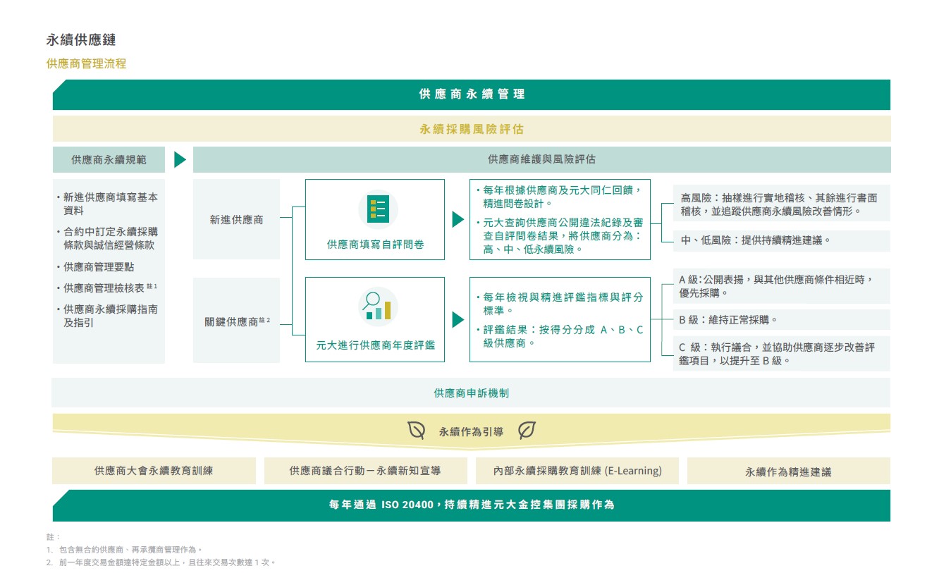 為建置完善的「永續採購流程」,各子公司皆已導入 ISO 20400 永續採購指南並取得驗證,以系統化管理永續採購流程,將永續觀念全面落實於子公司的採購流程中。