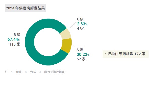 本公司希望透過評鑑方式鼓勵並輔導供應商持續提升產品與服務品質並深化永續發展作為,依據「供應商管理要點」由採購部門每年針對(1) 本集團年度交易金額前150 大者;(2) 各子公司前一年度累計交易總金額排名前5 大者;(3) 各子公司前一年度新往來之供應商進行評鑑,其評鑑內容依據ISO 20400 永續採購指南的七大核心主題及國際相關準則訂定,將「永續發展」作為評鑑項目之一。並將主要供應商依據評鑑結果分為A、B、C 三級(註),A 級供應商將於供應商大會公開表揚,且於比價、議價或其他選商程序,若遇有其他遴選條件相當者,得優先由評鑑A 級供應商承作;另針對C 級供應商加強輔導精進,次年度再度評鑑,以後續追蹤,若有連續三年皆為C 級之供應商,本公司得拒絕與其往來。且若發現供應商涉及違反永續發展政策且對環境與社會有顯著影響時,本集團將拒絕與該供應商往來。
